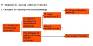 1. Werknemer (W): dit element richt zich op signalen van werknemerschap, zoals werkinhoudelijke en organisatorische aansturing door de werkgever. De ‘kernactiviteit’ van de organisatie is uit de beoordeling gehaald om een evenwichtige afweging tussen werknemerschap en zelfstandigheid te maken.